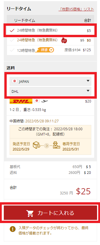 今回はデフォルトの「24時間特急」としました.この場合,製造工程に着手してから24時間程度で基板が完成します(すごいですね).費用は基板のサイズによりますが,今回は小さいので5枚で5ドル(現時点の為替レートだと650円)でした.