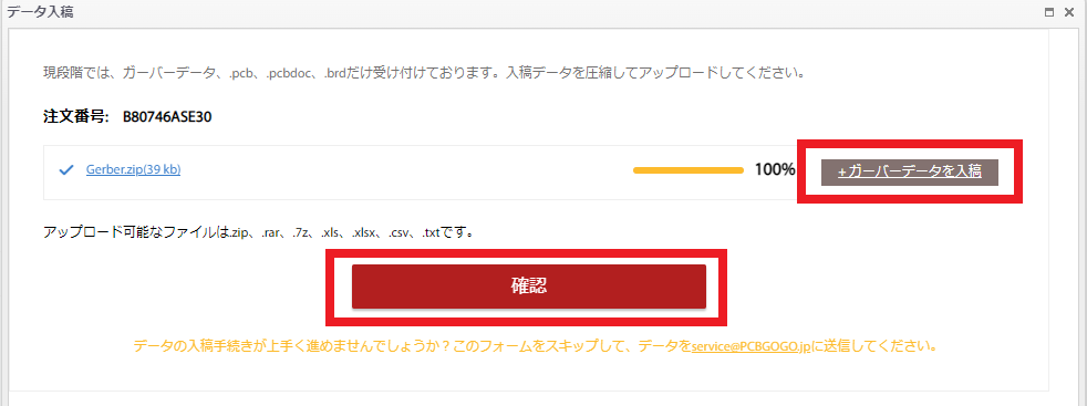図138のような表示が出るので,「ガーバーデータを入稿」をクリックして,ガーバ・データを登録します.少し待つとデータのアップデートが完了するので,「確認」ボタンをクリックします.