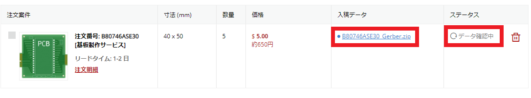 ガーバ・データをアップロードすると,図139のような画面が表示されます.PCBGOGO側でガーバ・データの確認作業が行われている間は,「データ確認中」という表示が出ます.データの確認が終わるとメールで知らせてくれるので,それまでしばらく待ちます(この時は数分で完了した).