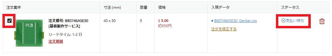 ガーバ・データの確認作業が完了すると,図140のように「支払待ち」という表示が出ます.この状態で基板の絵の左上にあるチェック・ボックスを選択して,画面を下にスクロールします.