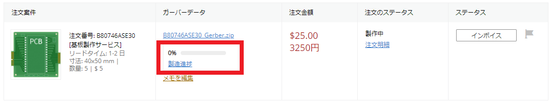 製造中は,図142に示すように「注文履歴」のページで基板の製造進捗がリアルタイムに表示されます.「製造進捗」をクリックすると,より詳細な状況を知ることができます.