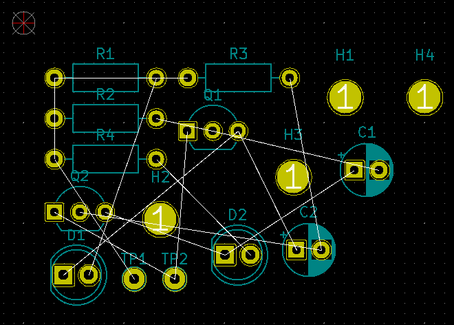 部品の各端子には,接続先を表す「ラッツネスト」(通称ラッツ)という線が表示されます.できるかぎりラッツが最短距離で互いに交わることなく終端するように部品を配置すると,後の配線の工程が楽になります.先に入力した回路図を思い浮かべながら配置すると,比較的スムーズかと思います.