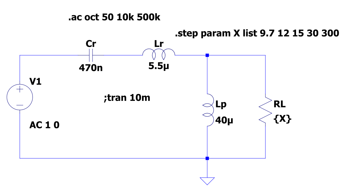 共振インダクタンスと共振キャパシタンスが決まったら,電子回路シミュレータ LTspiceに等価回路(図3)を入力して,伝達特性を解析して表示します(図4).