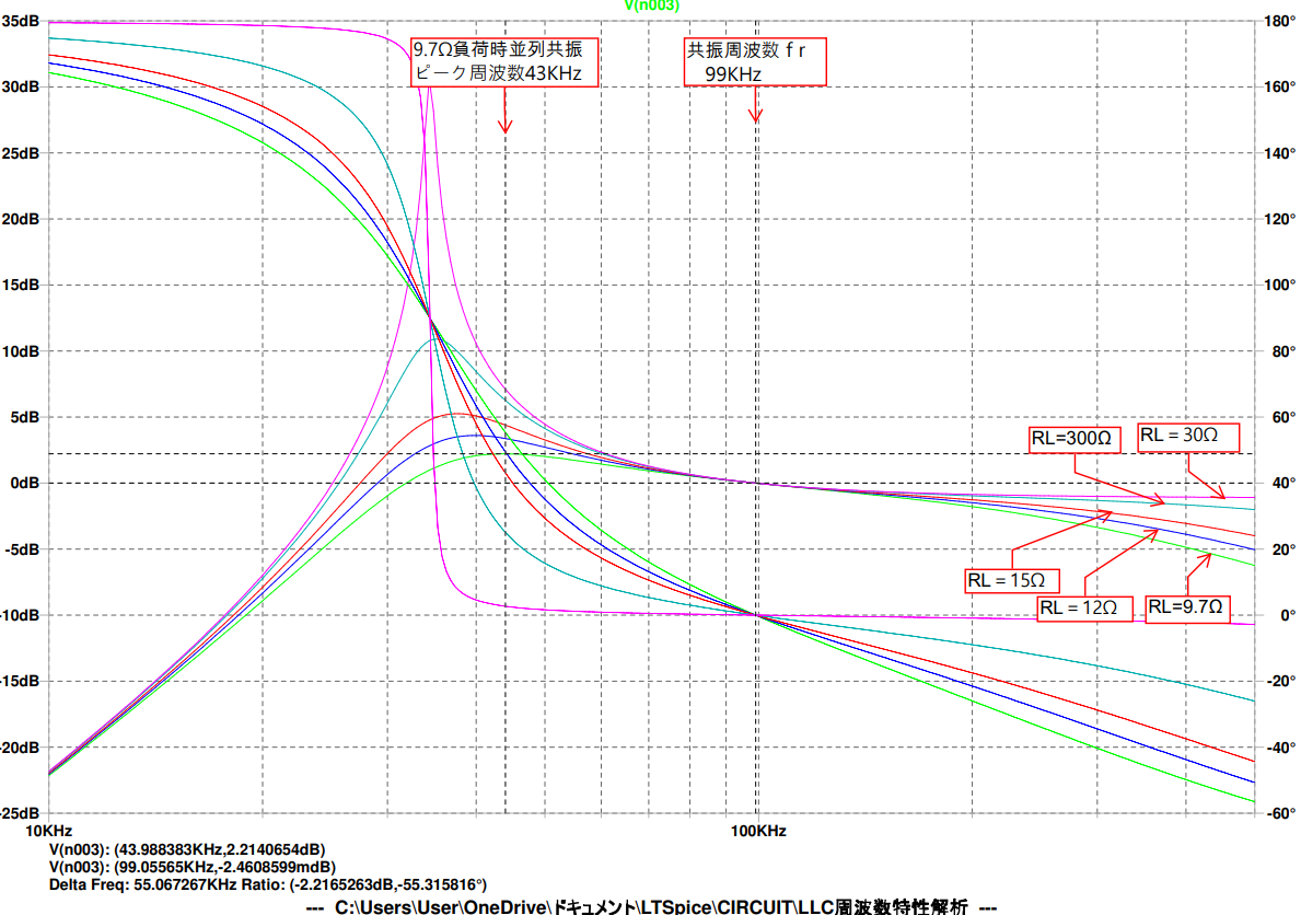 制御範囲を超えそうな計算結果が得られたら,$L_m/L_r$比(励磁インダクタンスと漏れインダクタンスの比)とトランスの巻き線比 $n$を調整して,全入力負荷範囲で制御可能になるように調整します.