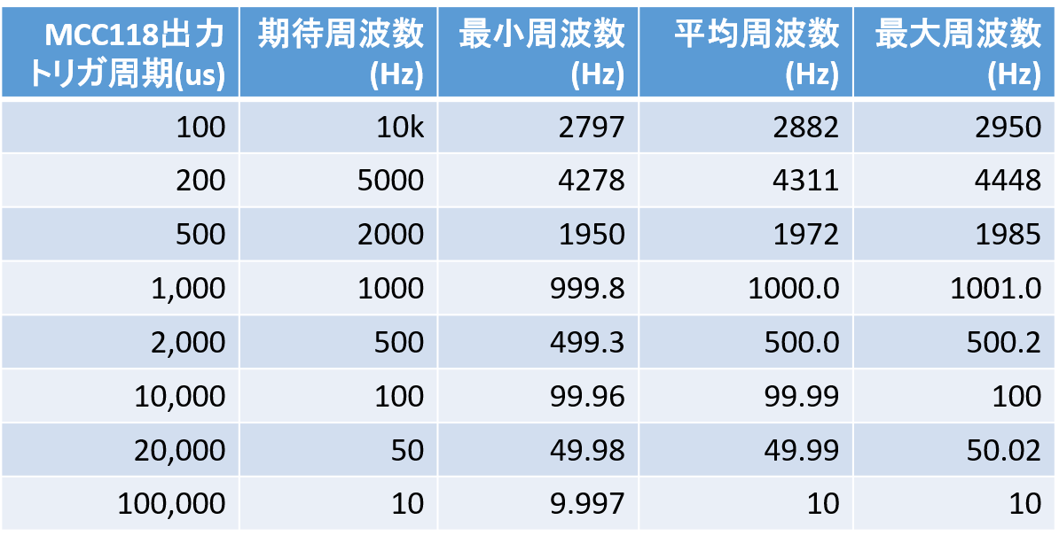 表2に,MCC 152からアナログ波形生成をさせた結果を示します.1kHzぐらいまで,出力周波数が正確になりました.ただし,周波数の揺らぎは残ります.