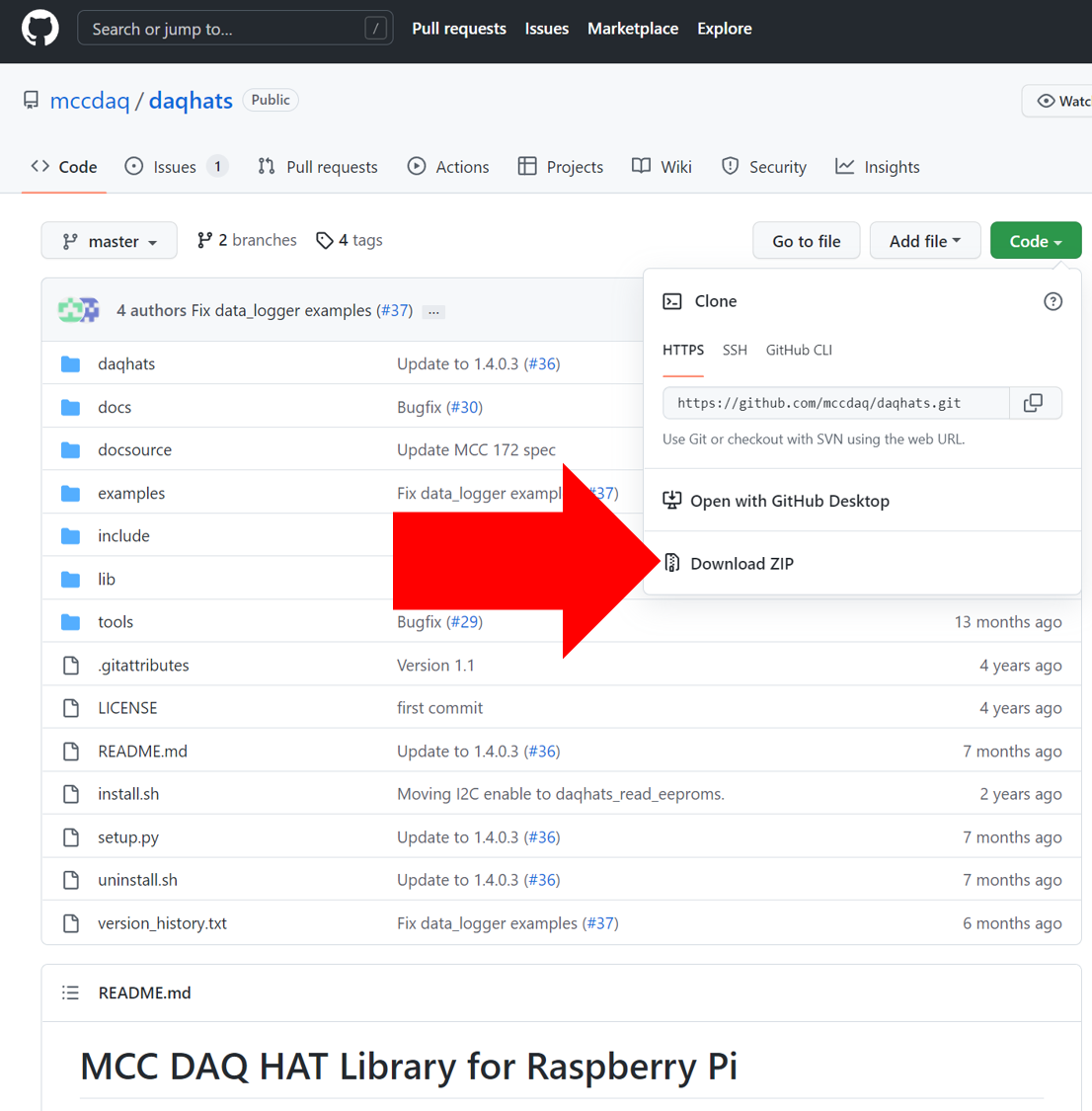 Download ZIPを選択すると(図3),“daqhats-master.zip”というZIPファイルにアーカイブされた形でダウンロードされます.このZIPファイルを作業ディレクトリ下へunzipし,後は図1と同様にビルドを行います.