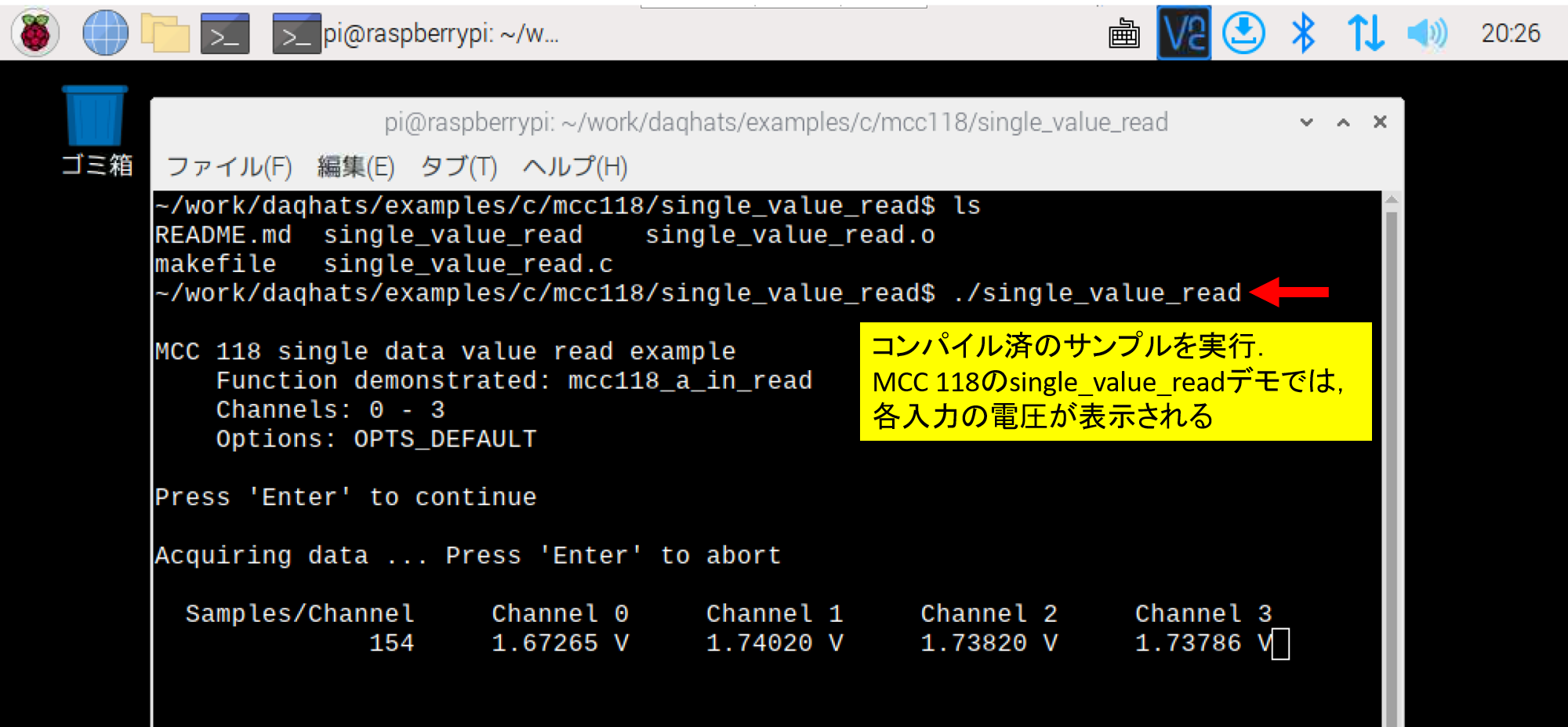 ラズベリー・パイが立ち上がったら,ソフトウェア・ライブラリであるMCC DAQ HAT library for Raspberry Pi(デモも同梱されている)をインストールします.