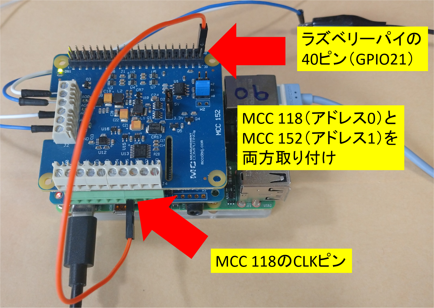 写真4 ラズベリー・パイ4の上にMCC 118とMCC 152を装着したところ(矢印はアドレス設定用のピン・ヘッダ)