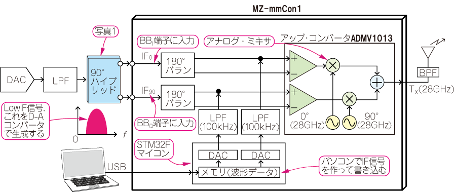 通信用のデータと$I/Q$キャリア(28GHz)を掛け合わせて周波数アップ