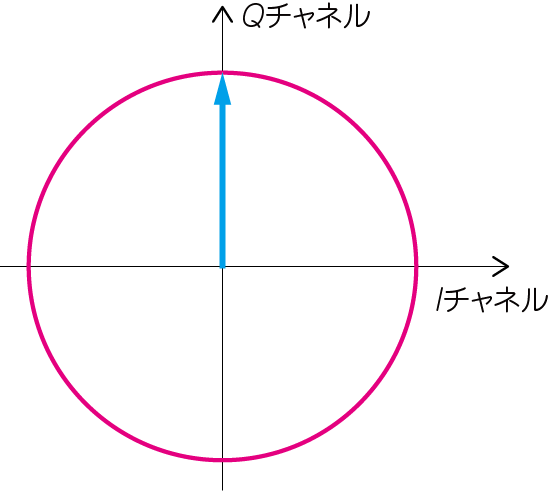 図7に示すのは,90°ハイブリッドに$I$信号と$Q$信号を入力して合成されたIF信号(矢印)のイメージです.矢印は円に沿って回転します.1Hzなら毎秒1回転です.$I$信号と$Q$信号は,IF信号を$I$軸上と$Q$軸上に写像したものです.