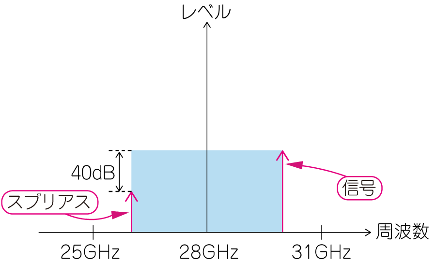 送信したい信号の帯域が広いほど,プリント・パターンを伝搬するときに生じる$I$信号と$Q$信号の遅延差が大きくなります.$I$信号と$Q$信号が伝搬するプリント・パターンの長さがそろうように細心の注意を払っても,数psの遅延差が生じます.もし,3GHzの$I$信号と$Q$信号の間に1psの遅延差が発生すると,直交精度で約1°の誤差を生みます.この1°の誤差は,31GHzの送信出力(Tx)が出ているとき,-40dBという大きなスプリアス(25GHz)の発生原因になります(図4).ケーブルで伝送したりしようものななら,遅延差は1桁悪化します.