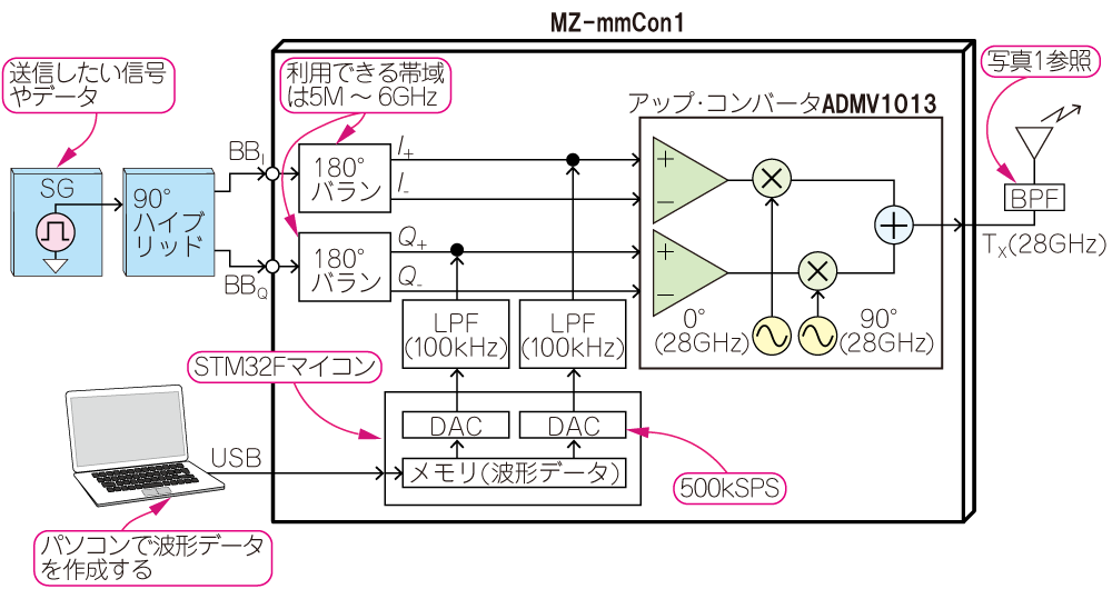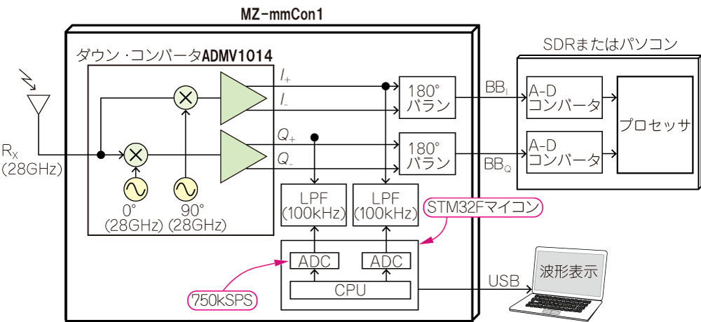 を使った28GHz伝搬実験システムで,ZeroIFダウン・コンバージョンを行うときののシグナル・フロー