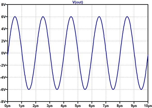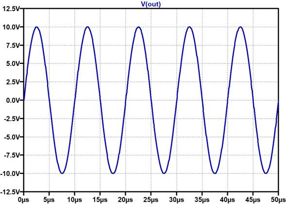 スルー・レートによる制限は,信号周波数が中庸でも振幅が大きいときに起きやすいものです.図8はADA4510-2を100kHzで,出力を10V$_{text{Peak}}$(20V$_{text{P-P}}$)で振幅させたケースです(ボルテージ・フォロア).なお電源電圧は$pm rm$15Vに変更しています.当然のごとく正弦波が出力されています.