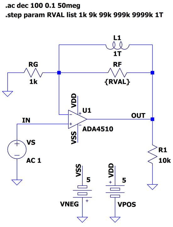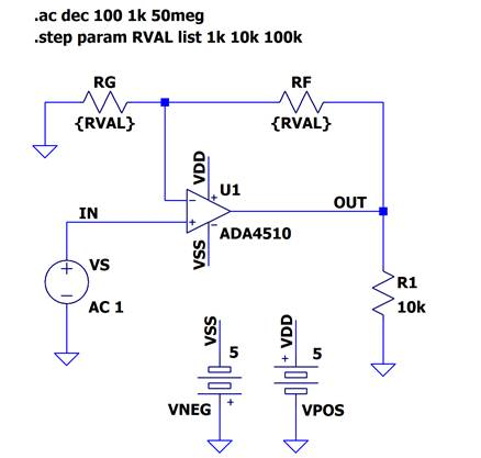 以下の図10は,ADA4510-2を使ったゲイン2倍の非反転増幅回路です.ここでは同じ非反転増幅のゲインのままで,抵抗値を1k$Omega$,10k$Omega$,100k$Omega$と3条件変えてシミュレーションをしています.