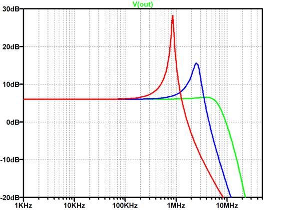 このシミュレーション結果を図11に示します.抵抗値が1k$Omega$のときはゲインはなだらかに低下していますが,10k$Omega$,100k$Omega$と増加させていくと,なだらかに低下していくべくところにピークが見えます.100k$Omega$では20dB以上のピークが観測されています.これが不安定な状態に近づいている状態です.ここに注意しなくてはなりません.これは抵抗とADA4510-2入力端子の入力容量とで生じる$RC$位相遅れが原因です.