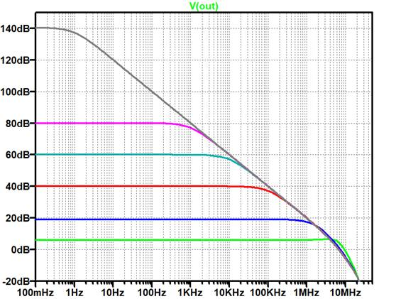 図3は目的の動作ゲインを2倍,10倍,100倍,1,000倍,10,000倍(6dB,20dB,40dB,60dB,80dB)としたLTspiceでのシミュレーション回路(.stepというコマンドを使用している)です,