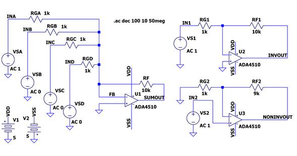 この回路は反転増幅回路を基本とした加算回路です.各経路は信号源側($R_{Gx}$)が1k$Omega$,フィードバック側($R_F$)が10k$Omega$になっているので,それぞれの経路のゲインは10倍になっています.そうするとゲインが10倍ですから,ADA4510-2の$GBP$ = 10.4MHzから,$-$3dB動作周波数特性が1MHz程度と見積もられるはずです.