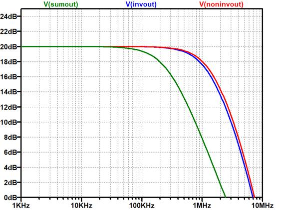 これが図7の周波数特性の違いであり,非反転増幅回路の周波数特性と比較して,加算回路の周波数特性は1/4程度になっていることがわかります.