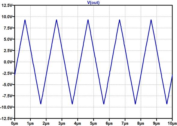 続いて,図9は周波数を500kHzにして,同じく10V$_{text{Peak}}$(20V$_{text{P-P}}$)で出力を振幅させたケースです(ほかの条件は図8と同じ).ここでは波形が三角波になっています.