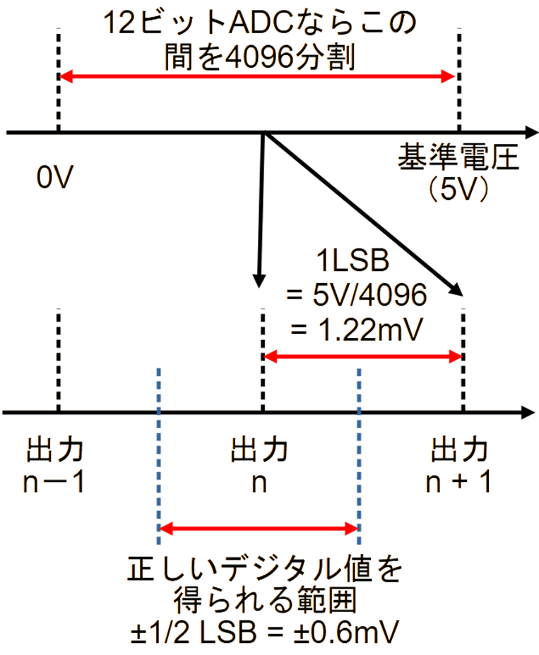 マイコンに内蔵されているA-Dコンバータは,12ビット程度の分解能のものが大多数ですが,5Vを基準電圧とすると,12ビットでの最小分解能(Least Significant Bit;LSB分解能)は,$\pm \text{LSB/2}$で$\pm$0.6mVになります.