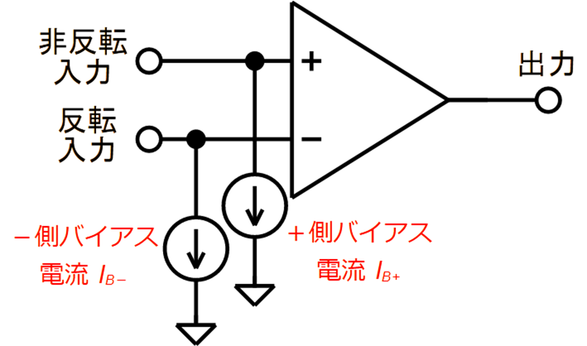 入力バイアス電流は,非反転・反転入力端子に流れ込む/流れ出る電流による誤差要素です.OPアンプは本来,2つの入力端子には電流は流れません.しかし,こののように$\mu$A以下程度の微小な電流が流れ,これが誤差要因になります.