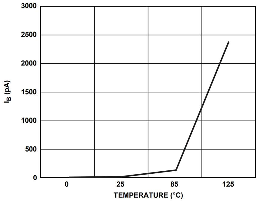 ここでの大事な注意点としては,JFET入力のOPアンプは入力バイアス電流が非常に小さいと説明しましたが,温度上昇によって指数的に入力バイアス電流が増加します.