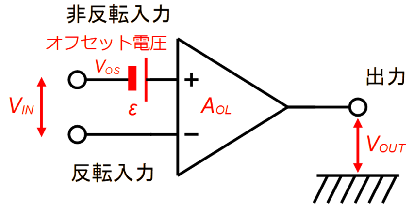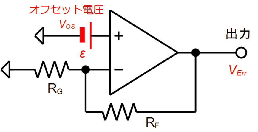 として増幅し,出力$V_{OUT}$が得られるものです.オフセット電圧$V_{OS}$はここに誤差要因$ V_{OS} = \varepsilon$ [V]が加わるもので,