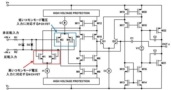 図7 レールtoレール入出力OPアンプADA4666-2の構成と2ペアの入力差動回路