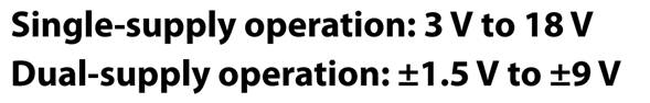 ここでは「Single-supply operation(単電源動作)」として,3Vから18Vと表記されています.その下には「Dual-supply operation(両電源動作): $\pm$ 1.5 V to $\pm$ 9V」とも表記されています.