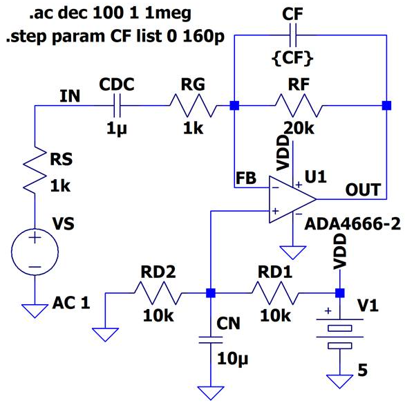 になります.コモン・モード電圧は$R_{D1}$と$R_{D2}$で決まり,電源電圧の半分の2.5V(中央)になります.$C_N$は無くても動作しますが,ノイズ除去として$-$3dBカットオフ周波数$f_{\text{Bias-3dB}}$が,信号の低域$-$3dB周波数$f_{\text{Low-3dB}}$よりも十分に低くなるように,