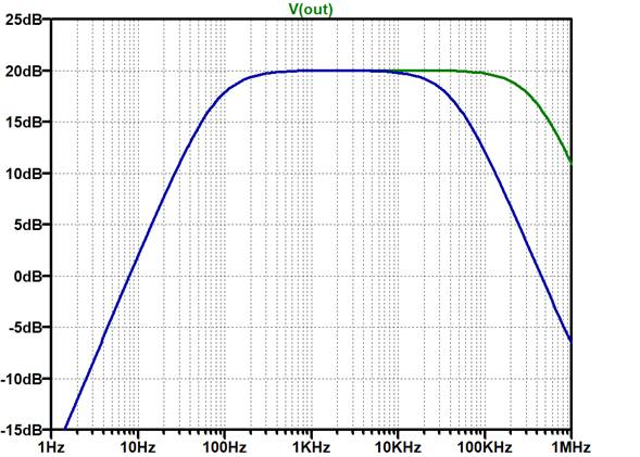 図11 図10のシミュレーション結果(緑:$C_F$ = 0pF,青:$C_F$ = 180pFで50kHzに帯域制限)