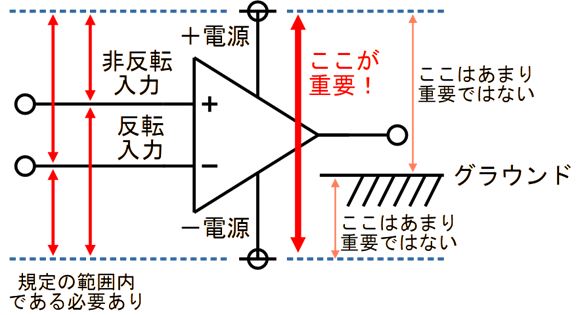 入力端子の電圧については,マイナス側電源電圧からみた入力動作電圧範囲(コモン・モード電圧)を満足していればよく,プラスとマイナスの電源電圧はグラウンド電位からみて非対称でも問題なく動作します.