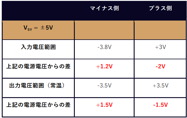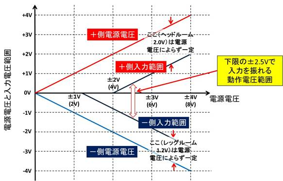 図4はこれを低電圧状態での入力電圧に関して図示したものです.最低動作電源電圧の$\pm$ 2.5V,つまり単電源の5Vにおいて,中央からプラス側が0.5V,マイナス側が1.3Vの動作範囲になることがわかります.