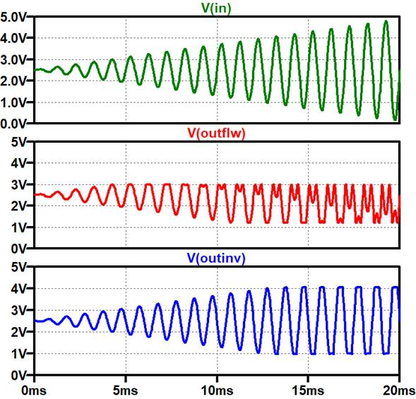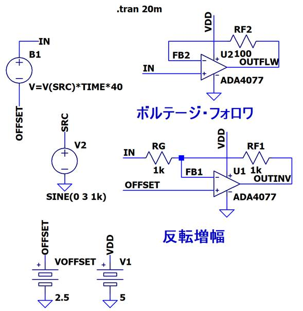 このようすを,LTspiceを用いてシミュレーションします.図5ADA4077-2を単電源・低電源電圧の5Vの条件でボルテージ・フォロア構成としたもの(入力電圧が変化する)と,反転増幅構成としたもの(入力電圧が変化しない)に,時間で振幅が増加する入力を加えてみたものです.図6はシミュレーション結果です.