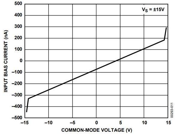 図9 OP184/OP284/OP484のコモン・モード電圧の変化による入力バイアス電流の変動