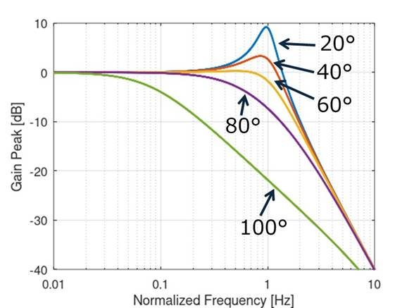 図10は周波数特性と位相余裕の関係です.回路入出力の周波数特性を周波数軸で確認します.周波数上昇でゲインが低減していく形状が位相余裕により異なっていますが,ゲイン・ピークが大きいほど回路が不安定です.図8の例は不安定な(位相余裕が少ない)ことがわかります.ここでも位相余裕を40° ~ 60°くらいにすると周波数特性がなだらかに変化し,安定で高速な状態になります.