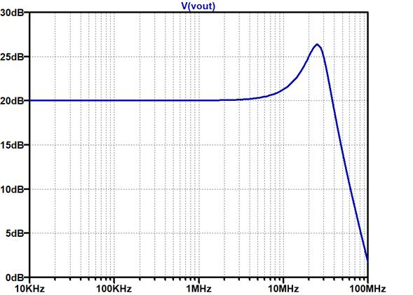 帰還抵抗$R_F$,$R_G$を適切な大きさから少し大きめにしており,帰還抵抗と入力容量(2.5pF)で位相遅れが生じる構成にしてあります.図12はこの回路の周波数特性をシミュレーションしたものです.ゲインのピークが7dB程度あり,位相余裕が30°程度と想定され,少し不安定ぎみです.
