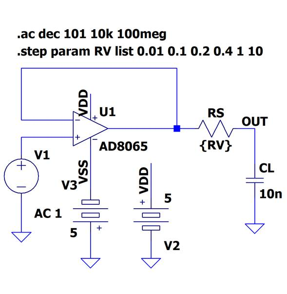 この回路はボルテージ・フォロアのため,先に説明した容量による進み位相補償は適用できません.そこで回路図のようにOPアンプ出力と容量負荷の間に抵抗$R_S$を挿入して,負荷容量を分離するという方法を取ります.