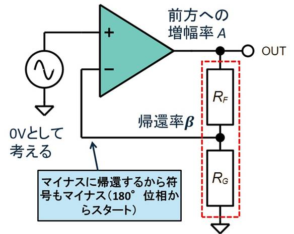 OPアンプのオープン・ループ・ゲインを前方への増幅率$A$とし,帰還率$\beta$を,