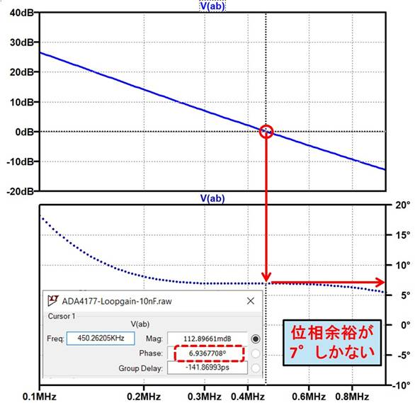 図20を拡大し,マーカを設定したものを図21に示します.ADA4177-2で10nF(0.01$\mu$F)を駆動する例(図6~図8)では位相余裕が7°しかなく,かなり不安定(異常発振寸前)だとこの結果からわかります.