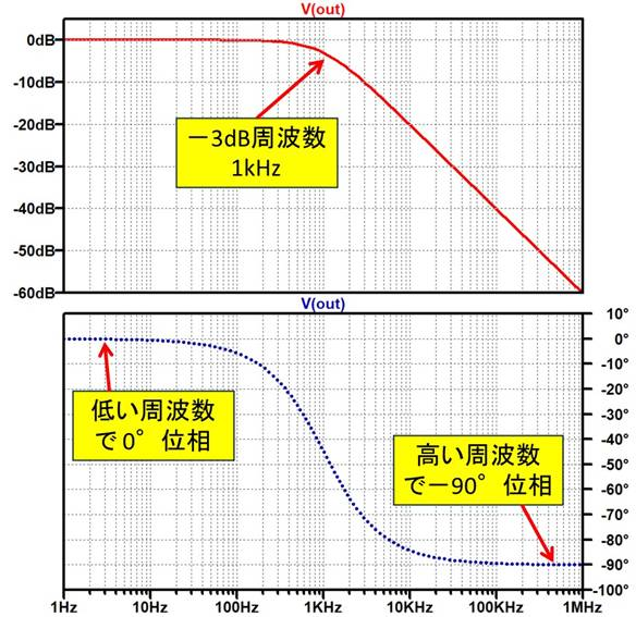 図2は抵抗とキャパシタ($RC$)で形成された,$-$3dB周波数が1kHzとなる$RC$ローパス・フィルタです.図3にこの入出力特性を示します.