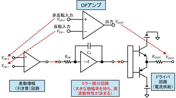 続いて図4にOPアンプの非常に基礎的な内部構造を示します.OPアンプは入力の差動増幅回路,大きなゲインと周波数特性を決める要素であるミラー積分回路,ドライバ回路から構成されています.このうちミラー積分回路は,抵抗$R_{IN}$とキャパシタ$C_F$と反転増幅回路から成り立っています.