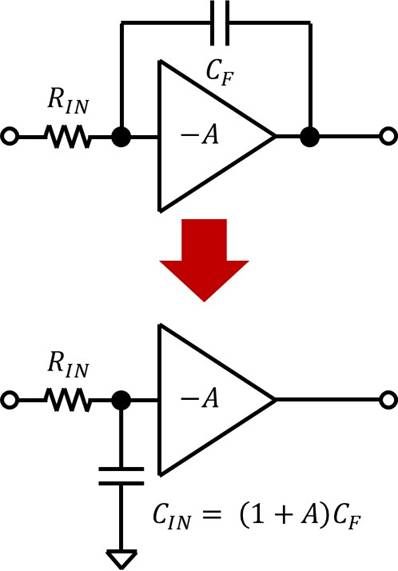 図中の$C_F$は,反転増幅アンプ部分のゲインを$-A$とすると,図5のように入力にシャントされる入力容量$C_{IN}$として等価的に置き換えられ,$C_F$が1$+A$倍に見えます.つまりこの回路の効果として,小さい容量でも非常に大きな(見かけ上の)入力容量$C_{IN}$を構成できます(たとえば$C_F$ = 1pF,$A=$1,000,000なら$C_{IN}$ = 1$\mu$F).