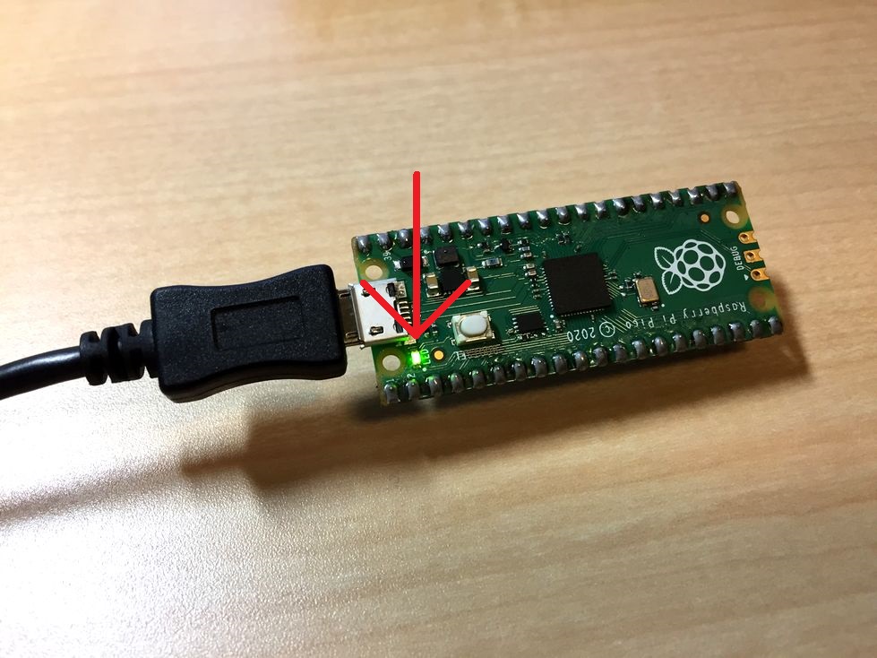 プログラムの書き込みが成功すると,ラズパイPicoは自動的に再起動します.写真2のようにボード上の緑色のLEDが点滅すれば成功です.
