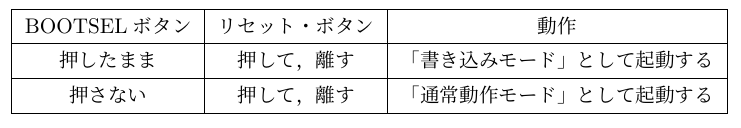 ラズパイPicoの動作モードは,リセットの直後(“RUN”端子の電圧レベルが“0”から“1”になった瞬間)に決まります(表1).リセットの直後にボード上の“BOOTSEL”ボタンが押されていれば,「プログラム書き込みモード」として動作します.一方で,リセットの直後に“BOOTSEL”ボタンが押されていなければ「通常動作モード」として動作します.