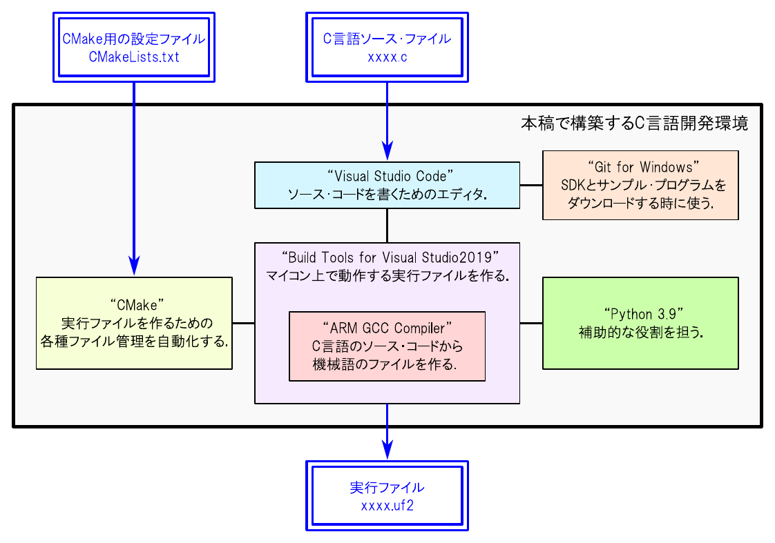“ARM GCC Compiler”および“Build Tools for Visual Studio 2019”は,この開発環境の中核です.“CMake”は実行ファイルのビルドに必要な各種ファイルの管理を自動化するためのツールです.“Python 3.9”はプログラミング言語“Python”の実行環境そのものですが,ここでは補助的な役割を果たします.