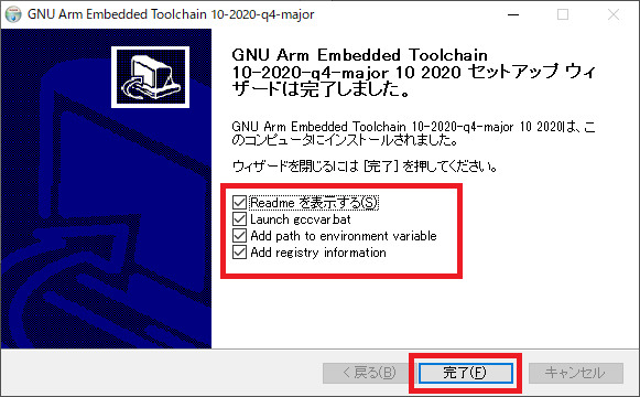 インストールが完了すると図11の画面が表示されるので,すべてのチェック・ボックスにチェックを付けて [完了] をクリックします.この時表示されるウィンドウは,すべて閉じてしまってください.