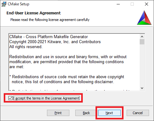 | 図16 “I accept the terms in the License Agreement”にチェックを付けて[Next]をクリックする | 図17 “Add CMake to the system PATH for all users”を選択して[Next]をクリックする |