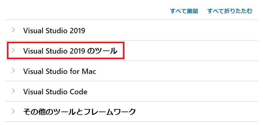 まずは,図22のように“Visual Studio 2019”のダウンロード・ページにアクセスします.画面を下にスクロールすると「Visual Studio 2019のツール」という項目があるので,これを展開します.