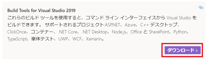 図23のように“Build Tools for Visual Studio 2019”という項目があるので,「ダウンロード」をクリックします.インストーラのダウンロードが始まるので,デスクトップなどのわかりやすい場所に保存します.